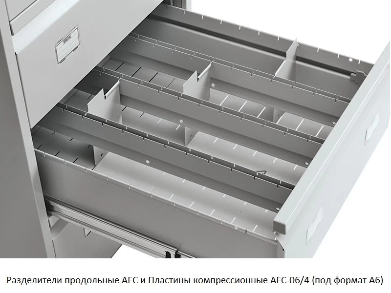 Картотека Практик AFC-06 состоит из шести ящиков, рассчитанных на хранение карточек А5 и А6, а также CD и DVD дисков. Для их размещения требуются дополнительные элементы: компрессионные пластины и продольные разделители (в комплект они не входят, их следует приобретать отдельно). Запираются все ящики одновременно посредством центрального ключевого замка ПРАКТИК, допускающего две тысячи комбинаций, среди достоинств которого следует отметить возможность смены цилиндра и прилагающийся мастер-ключ.