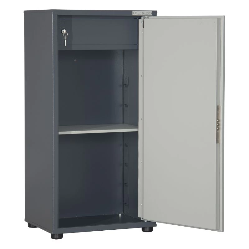 Шкаф офисный односекционный ШМ-90ТМ2 предназначен для хранения бумажных документов. Корпус и дверь шкафа толщиной 1 мм. Шкаф односекционный, оснащен съемной полкой, с изменяемой высотой постановки и трейзером. В двери установлен ключевой 8-ми сувальдный замок ЗАО «Про-Сам» г. Рязань или аналогичный замок другого производителя.
