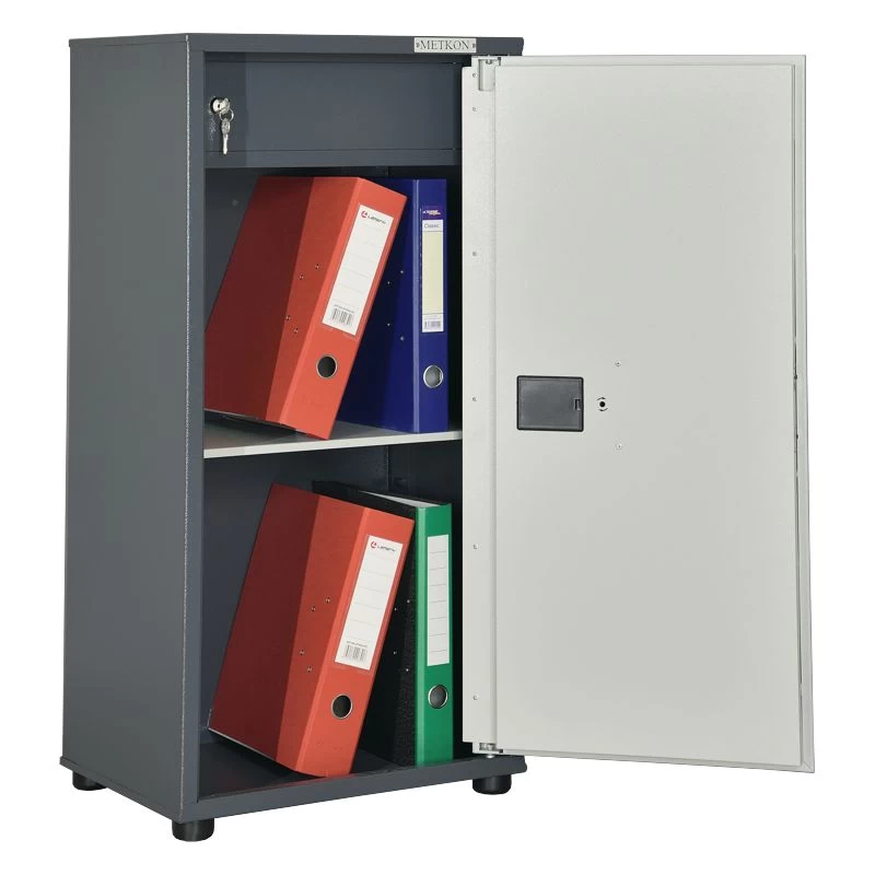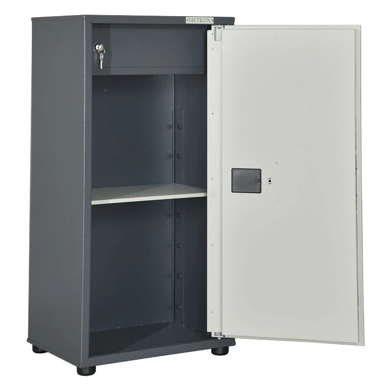 Шкаф офисный односекционный ШМ-90ТМ2Э предназначен для хранения бумажных документов. Корпус и дверь шкафа толщиной 1 мм. Шкаф односекционный, оснащен съемной полкой, с изменяемой высотой постановки и трейзером. В двери установлен электронный кодовый замок серии ЕА.