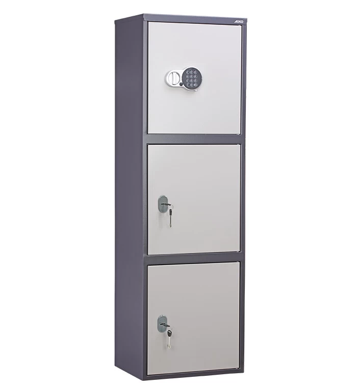 Шкаф Aiko SL-150/3Т EL – это прочное сварное изделие из стальных листов толщиной 1.2 мм. Состоит из трёх секций: в двух нижних имеются съёмные полки, а в верхней – кассовое отделение (трейзер) со своим замком. Полки можно передвигать по высоте с шагом 90 мм, позволяя распределить объём шкафа самым рациональным образом.