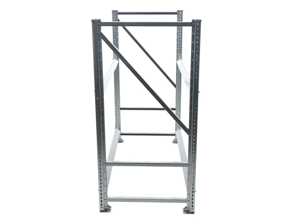 - Стойки изготовлены из оцинкованного металла. В основе их конструкции – угловой усиленный профиль с двухсторонней овальной перфорацией, существенно облегчающий монтаж и демонтаж.