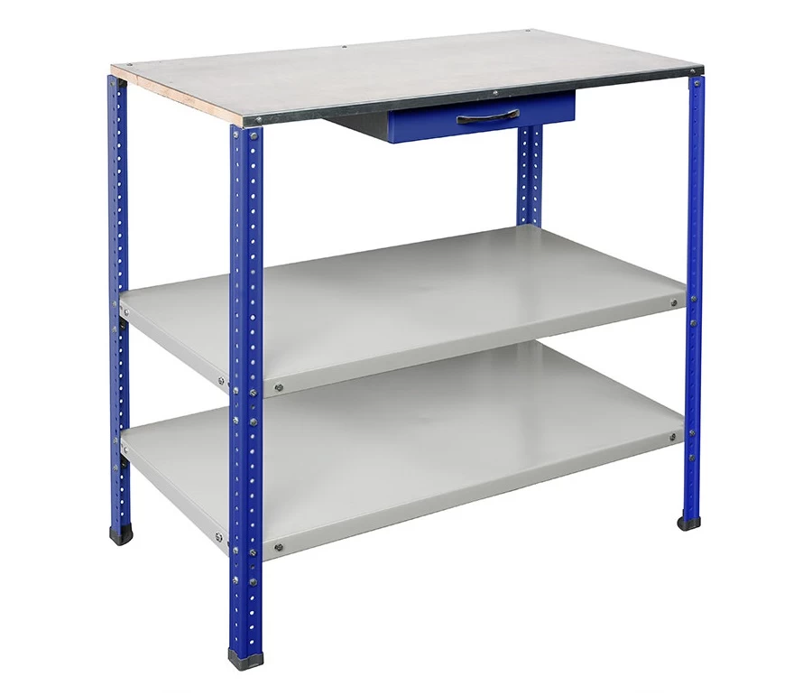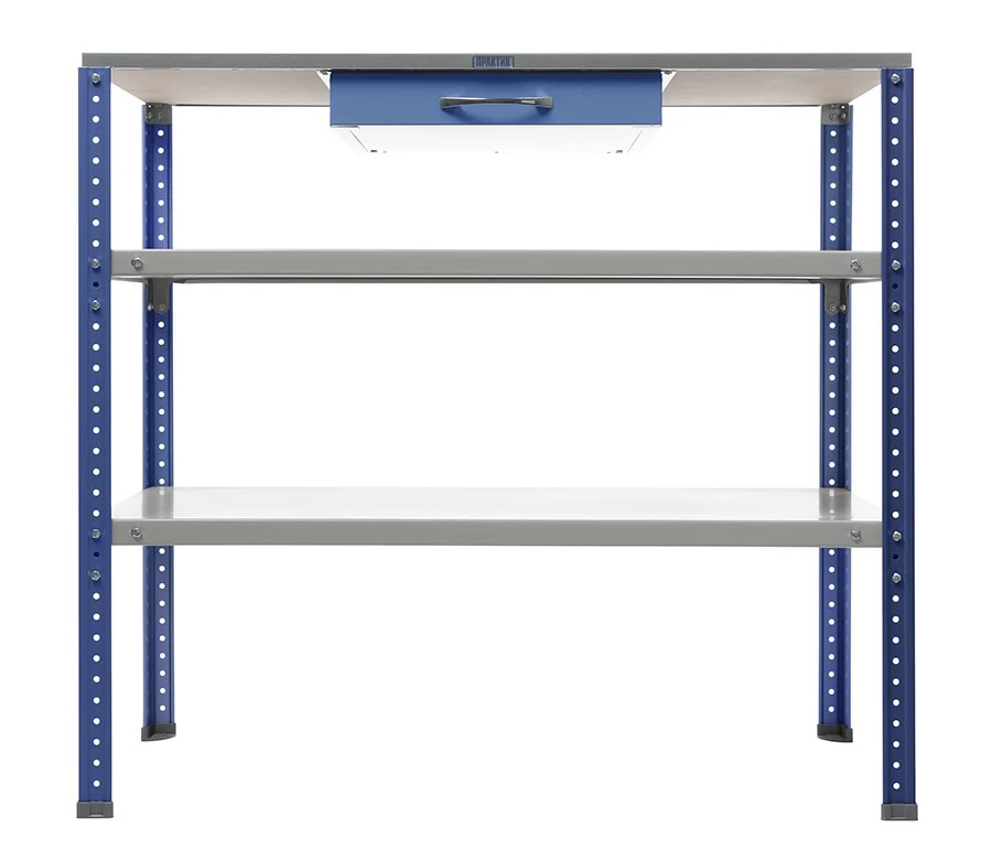 - Цветовое исполнение: полки и столешница – матово-серые, стойки и лицевая панель ящика – синие (ультрамарин).