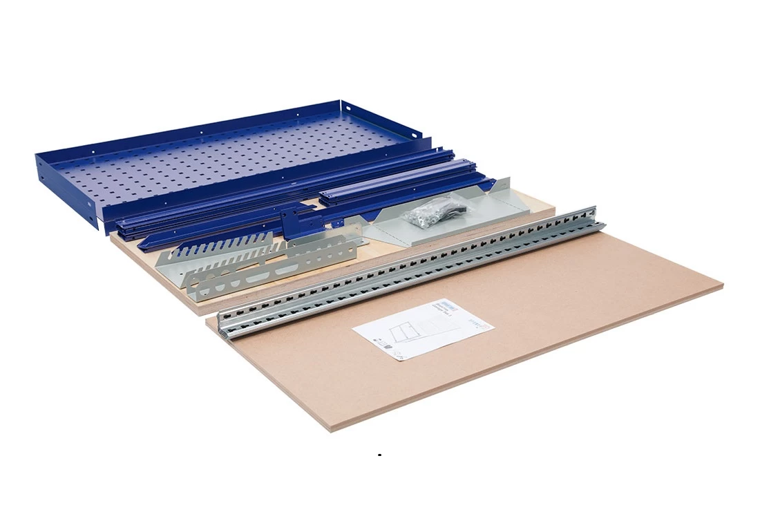 - Цветовое исполнение: полки – матово-серые; стойки, лицевые панели ящиков и экран – синие (ультрамарин).