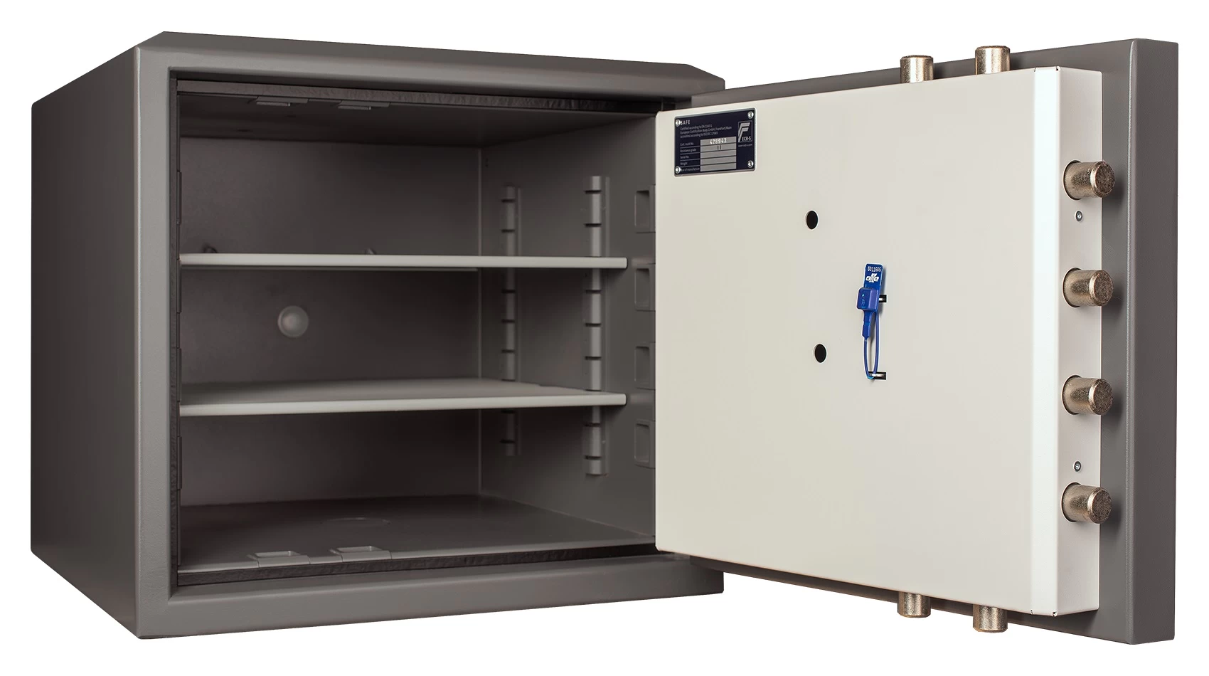 Дверь сейфа подвешена на мощных внешних петлях и распахивается на угол 180°, предоставляя владельцу полный обзор содержимого.