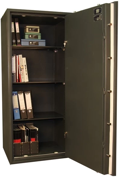 Запирание осуществляется посредством трёхстороннего ригельного механизма, отличающегося идеальной балансировкой и высокой точностью изготовления, что позволяет легко и плавно открывать сейф и увеличивает его долговечность. На дверь установлен электронный немецкий замок Wittkopp повышенной секретности. Чтобы предотвратить повреждение замка и ригелей, в замковую область утапливается двойная пластина из упрочнённой стали, легированной марганцем. Также используется технология введения в лицевую панель карбидных вставок и установка калёного стекла с механизмом блокировки ригелей, при воздействии орудий взлома наглухо фиксирущим дверь в запертом состоянии.
