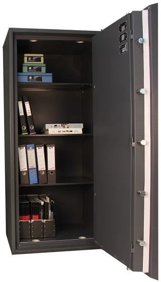 Универсальный сейф, предоставляющий комплексную защиту особо ценного имущества и крупных сумм денег на высоком уровне, исключающем как попытки взлома, так и повреждения содержимого при пожаре.