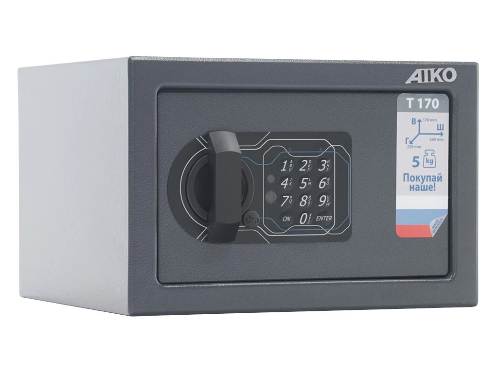 Модель Aiko T-170 EL представляет собою прочное сварное изделие из стальных листов толщиной 1.2 мм; дверь усилена за счёт лицевой панели в 2.8 мм. Запирается отечественным электронным замком PLS-3.2, к которому прилагается мастер-ключ для аварийного открывания. Замок кодируется сочетаниями из четырёх-шести цифр. Если батарейки будут разряжены, на введённый код это не повлияет.
