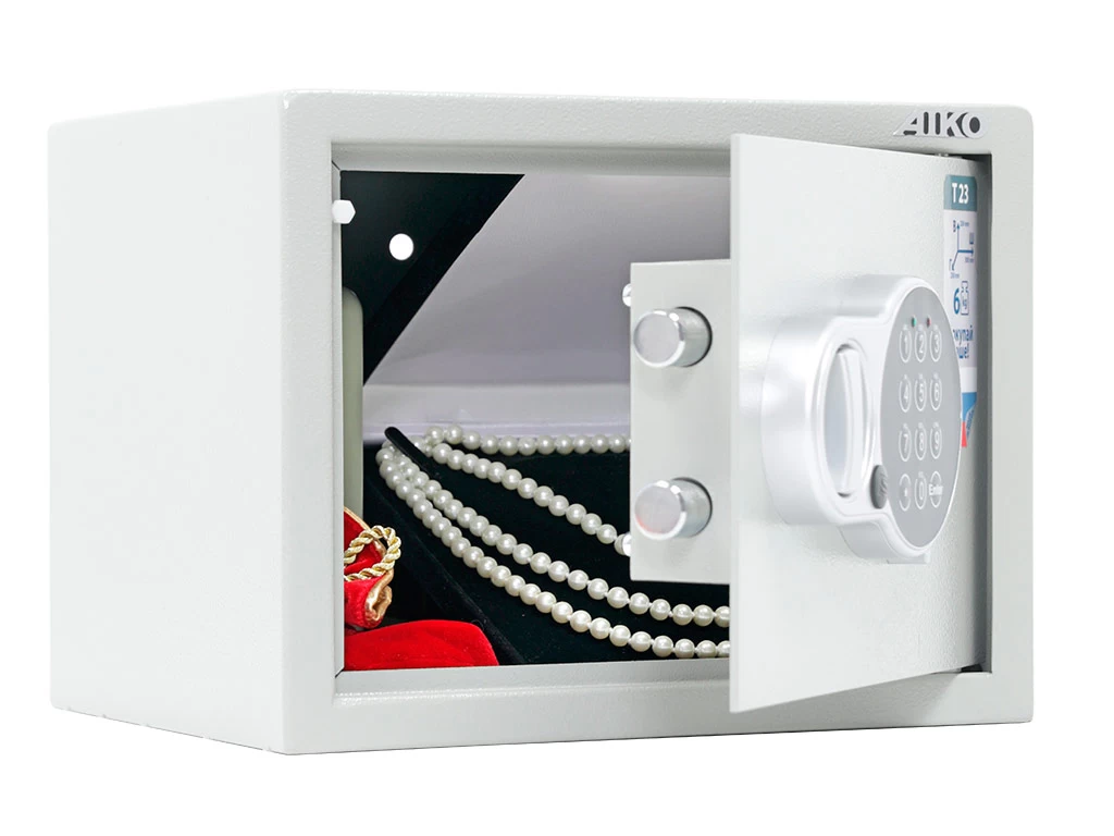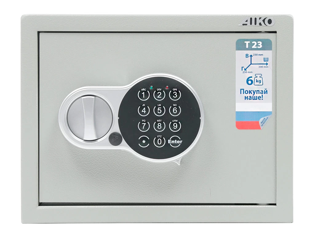 Модель Aiko T-23 EL представляет собою прочное сварное изделие из стальных листов толщиной 1.5 мм; дверь усилена за счёт лицевой панели в 3 мм. Запирается отечественным электронным замком PLS-1, к которому прилагается мастер-ключ для аварийного открывания. Замок кодируется сочетаниями из четырёх-шести цифр; питается от четырёх батареек 1.5 В (класс ААА); они легко заменяются с внешней стороны двери. Если батарейки будут разряжены, на введённый код это не повлияет.