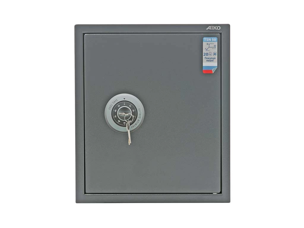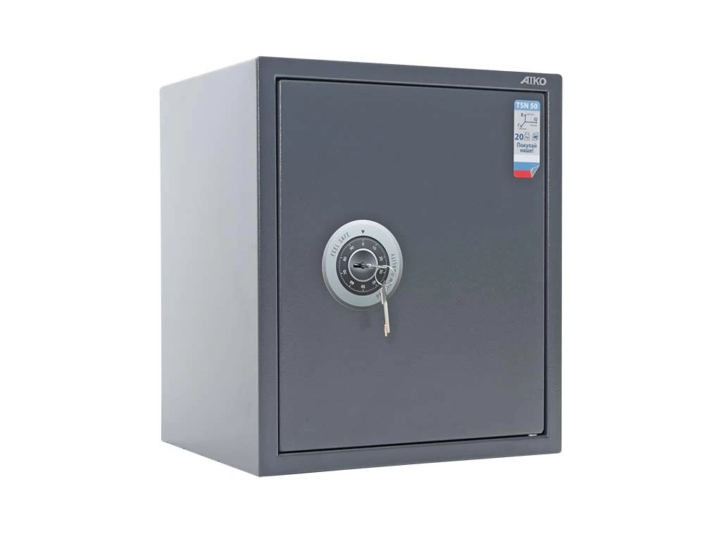 Aiko TSN.50 изготовлен из прочной стали и снабжён качественным ключевым замком Border, защищённым от внешних воздействий твердосплавной пластиной; внутри сейфа располагается съёмная полка. Также данная модель подходит для хранения короткоствольного оружия. Качество сейфа обеспечивается сертификатом соответствия ГОСТ Р 55148-2012: класс S1 (ГОСТ Р).