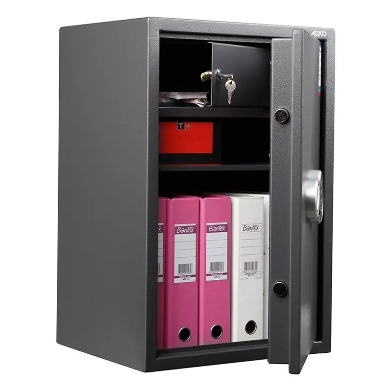 Для удобного и систематизированного размещения канцелярских папок, печатей, наличности и т.д. внутреннее пространство сейфа разделено съёмной полочкой, а также содержит дополнительное кассовое отделение – трейзер – габаритами 174×430×270 мм, запираемое отдельным ключом.