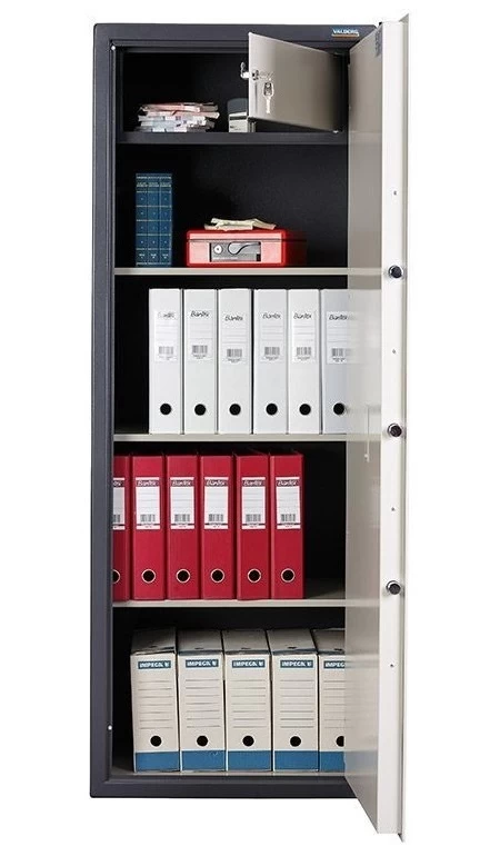 Модель ASM-165Т EL оснащена трейзером размерами 219x594x376 мм – отделением для денег, печатей и ценных мелочей, запираемым на ключ, – а также тремя съёмными полочками, которые можно передвинуть наиболее удобным образом. Исходя из размеров сейфа, он позволяет вместить до двадцати восьми папок-регистраторов формата А4 (типа Bantex, Корона и тому подобное).