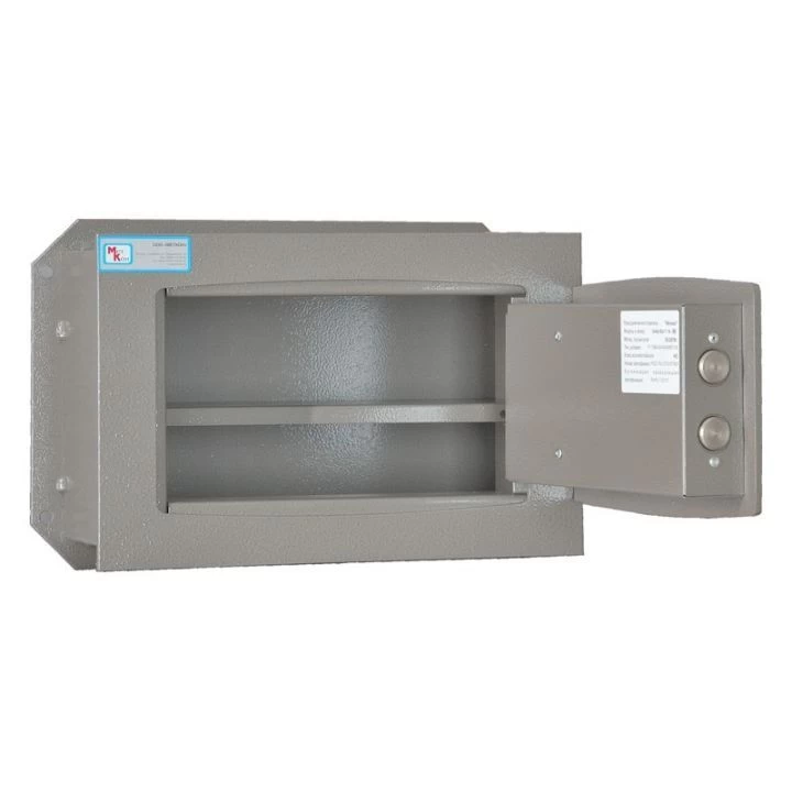 Дверь шкафа оснащена сейфовым замком сувальдного типа. Корпус сейфа толщиной 2 мм, лицевая панель и дверь толщиной 5 мм. На задней стенке корпуса расположены отверстия для крепления.