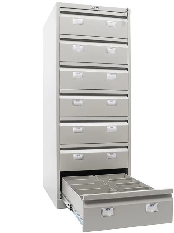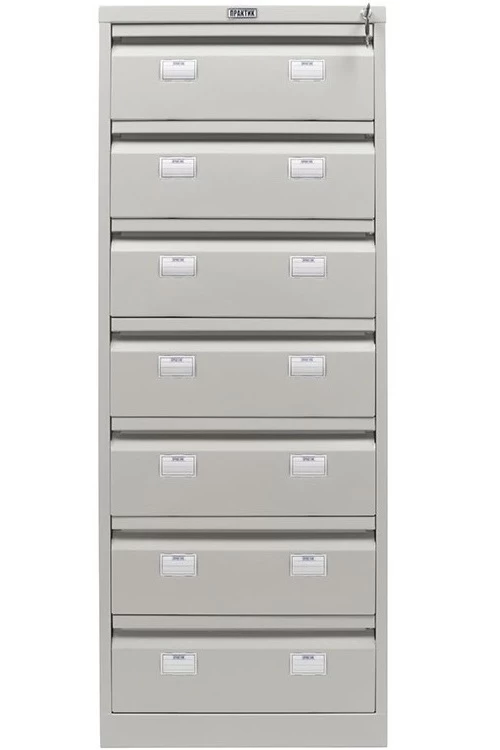 Картотечный шкаф Практик AFC-07 – это исключительно удобное и необходимое в любом современном офисе оборудование для эффективной работы с карточками формата А5. О высоком качестве изделия свидетельствует сертификат ГОСТ 16371-2014, а также декларация о соответствии Техническому регламенту Таможенного союза «О безопасности мебельной продукции».Детали картотеки изготавливаются из качественных сортов стали высокой прочности с расчётом на длительное интенсивное использование. Это доказывают результаты промышленных испытаний: при полноценной загрузке, составляющей 20 кг на ящик, с успехом было проделано более 50 000 открываний. Ящики плавно и без усилий выдвигаются на всю глубину благодаря наличию телескопических направляющих. Для достижения наилучшей устойчивости изделие оснащено антиопрокидывающим устройством, не допускающим возможности выдвинуть два или более ящиков одновременно.