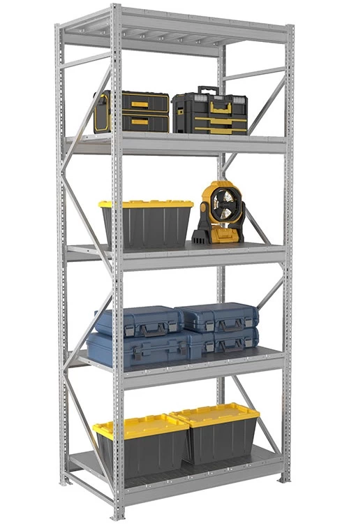 Стойки изготовлены из оцинкованного металла. В основе их конструкции – угловой усиленный профиль 56×47 мм с двухсторонней овальной перфорацией, существенно облегчающий монтаж и демонтаж. Шаг перфорации для крепления полок – 50 мм.
