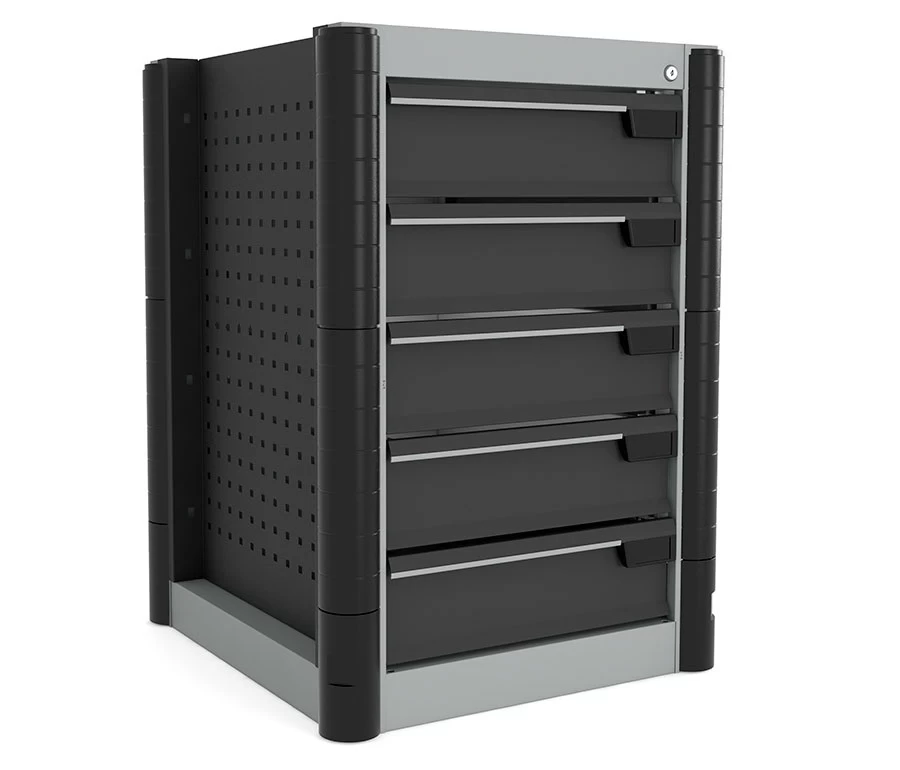 - Боковые стенки представляют собой перфорированные панели (отверстия 10х10 мм), где можно навесить держатели разных видов, полки и крючки для визуально удобного и эргономичного размещения наиболее часто используемых предметов: свёрл, шестигранников, торцевых головок, баллончиков, стретч-плёнки, полотенец, ключей и пр.
