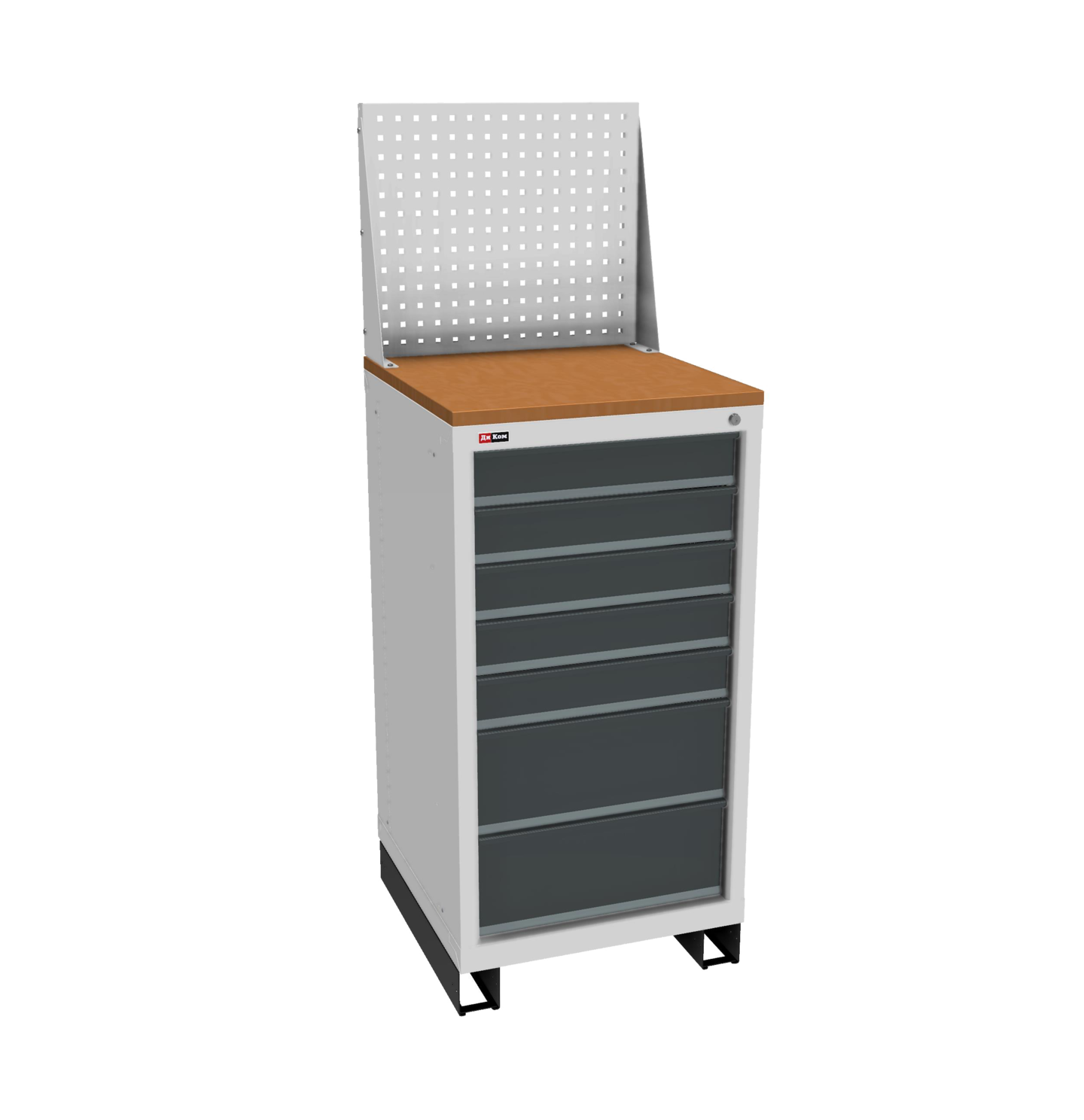 Тумба инструментальная ВЛ-К-017-05 предназначена для удобного хранения инструментов, оснастки и мелких деталей в гараже, автомастерских и на производственных предприятиях. Все металлические элементы окрашены эпоксидной порошковой краской двух цветов: корпус и экран - агатово-серый RAL 7038; ящики - антрацитово-серый RAL 7016. Такая краска защищает от мелких царапин и появления коррозии.