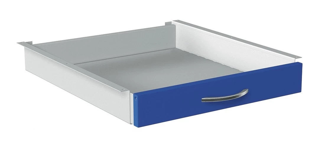 - Цветовое исполнение: полки – матово-серые; стойки, лицевые панели ящиков и экран – синие (ультрамарин).