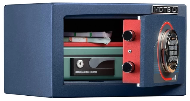 Дизайн сейфа – колоритная двойная окраска: синяя снаружи и красная изнутри. Порошковое покрытие на эмалевой основе успешно предохраняет изделие от различных бытовых повреждений, а также отталкивает пыль и предотвращает коррозию.