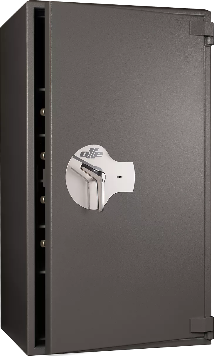 А вскрытие сейфа через замок, минуя этап пробивания толстой многослойной двери, исключается, поскольку модель OLLE AM75L оборудована специальным ключевым замком высокой секретности, механизм которого снабжён уникальной керамической защитой. Запирание замка активирует ригельную систему из восьми массивных стальных цилиндров – ригелей: при попытке деактивировать замок они выдвигаются в пазы на корпусе, надёжно блокируя дверь.
