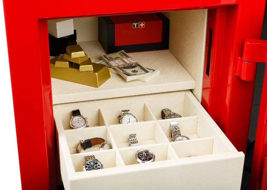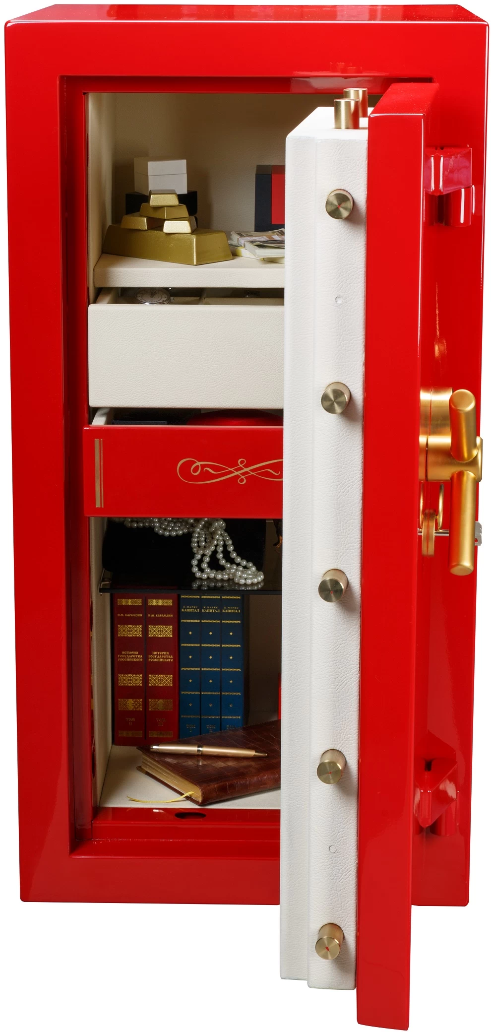 Дизайн поверхности – эффектное лаковое покрытие ярко-красного цвета, предохраняющее от коррозии и царапин; также возможен выбор цвета по вашему выбору. Изнутри сейф отделан белой кожей, что придаёт сейфу элитарный вид и обеспечивает вашим ценностям исключительно комфортные условия хранения.