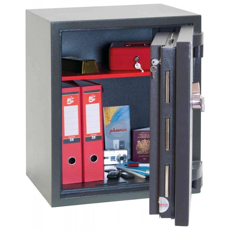 Высокое сопротивление взлому обеспечивается специфичными нюансами конструкции: сейфы Phoenix HS2052E обладают двойными стенками общей толщиной 45 мм из двух слоёв стали, пространство между которыми заполнено высокопрочным композитным материалом, особенно устойчивым к атакам путём сверления.