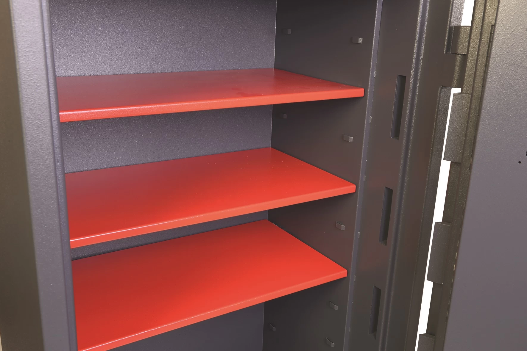 Внутри расположены три съёмные полочки, которые можно передвигать по высоте, максимально удобным образом организуя полезное пространство сейфа.