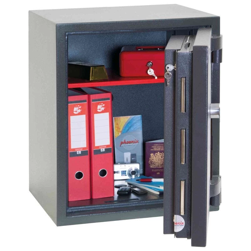 Высокое сопротивление взлому обеспечивается специфичными нюансами конструкции: сейфы Phoenix HS3552E обладают двойными стенками общей толщиной 45 мм из двух слоёв стали, пространство между которыми заполнено высокопрочным композитным материалом, особенно устойчивым к атакам путём сверления.