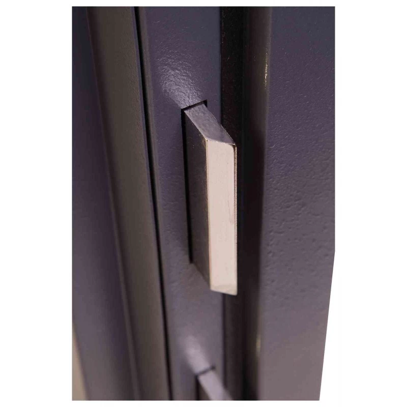 На дверь установлена трёхсторонняя ригельная система с пятью мощными стальными плоскими ригелями толщиной 100×10 мм, дополненная сплошным пассивным ригелем со стороны петель. Попытка выбить замок активирует блокировку ригелей: полное их утапливание в толщу лицевой панели, исключающее снятие двери с петель.