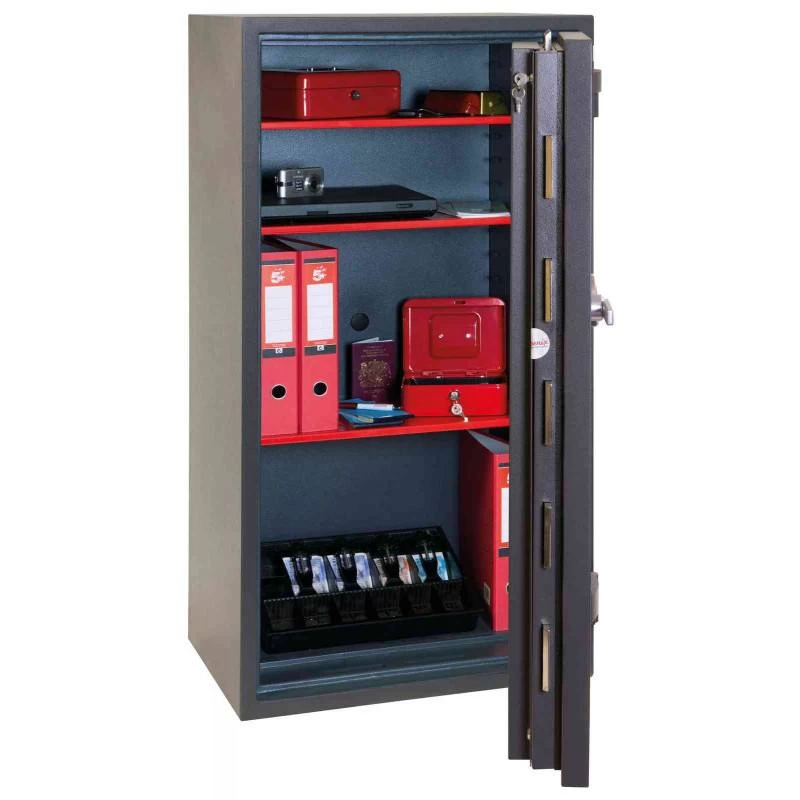 Внутри расположены три съёмные полочки, которые можно передвигать по высоте, максимально удобным образом организуя полезное пространство сейфа.