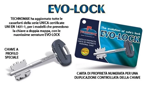 На дверь сейфа Technomax DPK/5 установлен запатентованный ключевой замок EVO-LOCK, защищаемый от механических воздействий за счёт встроенной в область замка металлической пластины из особого твёрдого сплава. Дверь можно раскрыть под максимальным углом 90°.