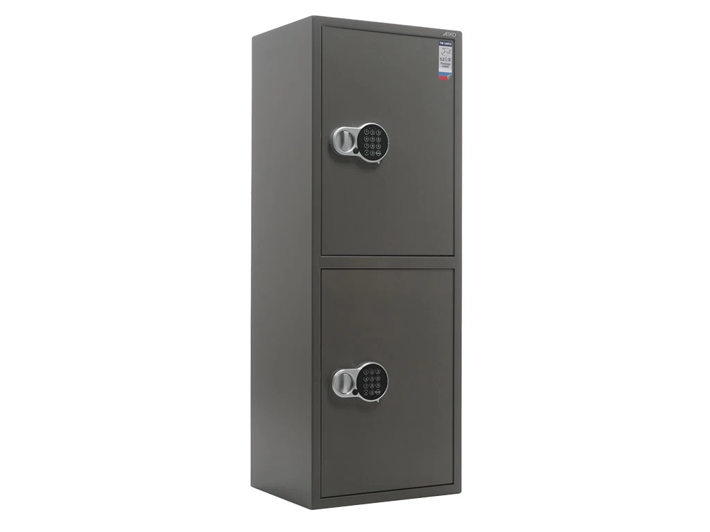 Толщина лицевой панели – 5 мм. Aiko TM-120/2T EL изготовлен из прочной стали; область замка обеих секций защищена от внешних воздействий твердосплавной пластиной. Качество сейфа обеспечивается сертификатом соответствия ГОСТ Р 50862-2012.