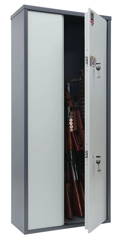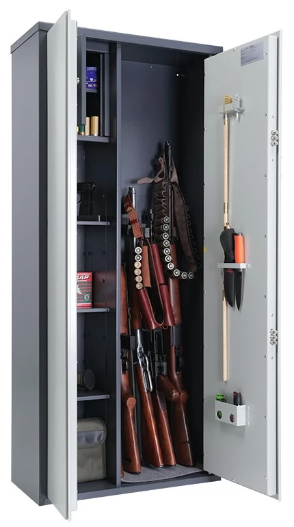 Вертикальная перегородка разделяет пространство сейфа надвое: в одной части располагаются полочки и отделение для патронов размерами 300×178×185 мм, снабжённое собственным замком, а во второй – ложементы, которые аккуратно фиксируют стволы, создавая условия для исключительно удобного хранения.