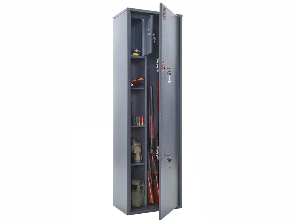Поверхность оружейного шкафа обработана качественным защитным составом; цветовой дизайн – нейтральный тёмно-серый оттенок.