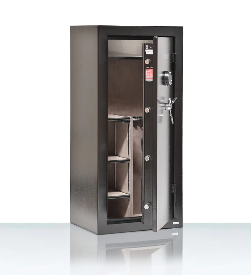 Мощный корпус, надёжный замок и четырёхсторонний ригельный механизм обеспечивают высокий уровень защиты от профессионального взлома. Десять металлических ригелей с диаметром 3 см по четырём сторонам двери фиксируют её в запертом состоянии, даже если злоумышленниками срезаны петли.