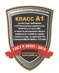 Принадлежит к категории охотничьих сейфов высокого качества, рассчитанных на комфортное содержание четырёх стволов длиной до 1.49 метра. Сейф располагает сертификатами на взломостойкость и всецело отвечает требованиям МВД РФ к хранению огнестрельного оружия и боеприпасов. Отнесён к классу S1, что соответствует классу оружейных сейфов А1 по нормативам ГОСТ Р 56367-2015.