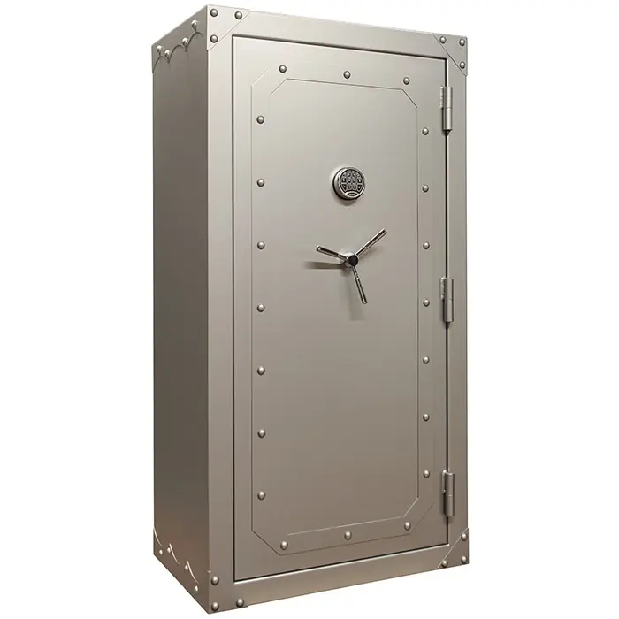 Rhino Metals KSB 7136 EX UN EL TITANIUM Kodiak – сейф премиум-класса категории огневзломостойких, произведённый компанией Rhino Safe (США). Модель универсальна – помимо хранения оружия, может применяться и в качестве классического сейфа для ценностей. Современные технологии удачно сочетаются с винтажной эстетикой: корпус украшен высокодекоративным покрытием «Titanium».- Вместимость изделия позволяет разместить до 44 ружей, а также многочисленные аксессуары и боеприпасы, что подтверждено данными производителя.