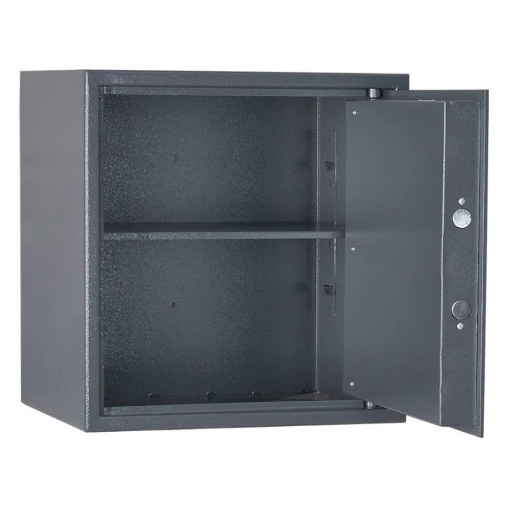 - Сейф односекционный, оснащен съемной полкой и Трейзером.