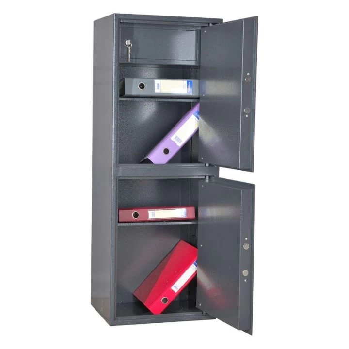 Корпус шкафа выполнен из высококачественной стали с полимерно-порошковым покрытием, устойчивым к механическим повреждениям и коррозии. Внутреннее пространство может быть организовано с помощью регулируемых по высоте полок, что позволяет удобно размещать папки формата A4 и другие документы. Надёжный замок обеспечивает базовую защиту содержимого от несанкционированного доступа.