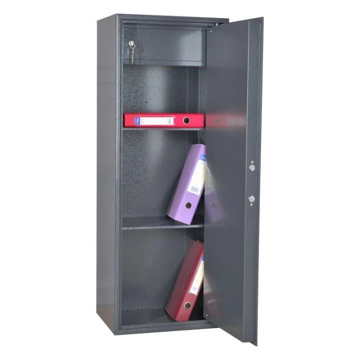 Корпус шкафа выполнен из высококачественной стали с полимерно-порошковым покрытием, устойчивым к механическим повреждениям и коррозии. Внутреннее пространство может быть организовано с помощью регулируемых по высоте полок, что позволяет удобно размещать папки формата A4 и другие документы. Надёжный замок обеспечивает базовую защиту содержимого от несанкционированного доступа.